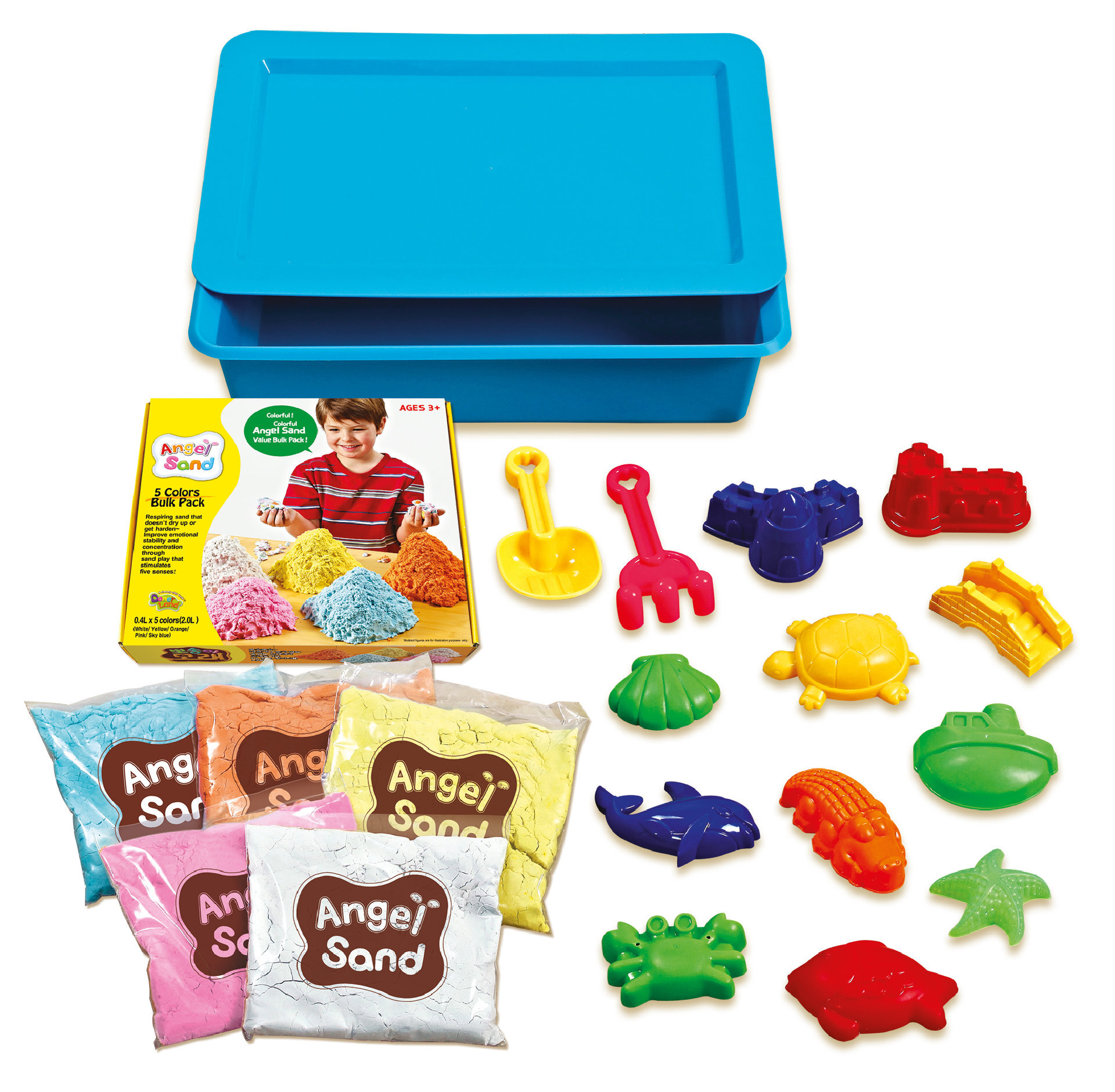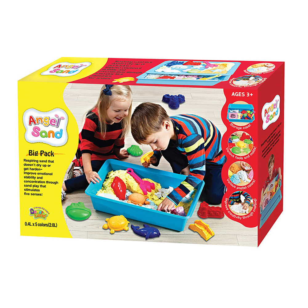 天使動力沙是一種沙子形式的新型黏土,在沒有水的情況下保持固體狀態,也能輕鬆讓它恢復沙子型態。不會沾黏皮膚、好塑型、好清理,不會因為潮濕而結塊,也不會像沙子一吹就散開,天使動力沙擁有非常療癒的觸感,透過玩樂也能提高孩子的創造力跟想像力。天使沙-豪華遊戲組。內容物包含 : 天使沙(白色0.4L、黃色0.4L、橘色0.4L、粉色0.4L、藍色0.4L)、收納箱、玩沙工具、模具13個。