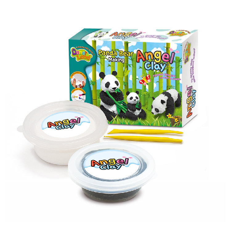 韓國Donerland天使黏土系列 : 天使黏土是一種以最新奈米技術研發的黏土,不沾手、好塑型、比一般黏土輕了1/8的重量。可以依照喜好,用水性顏料染出自己心目中的顏色,包括水彩、麥克筆、螢光筆、彩色筆等。天使黏土很輕,在日本、韓國都相當受小朋友喜愛。天使黏土-可愛小熊貓。以可愛熊貓為主題,內容物包含:天使黏土(白色40g、黑色25g)、黏土工具、說明書。