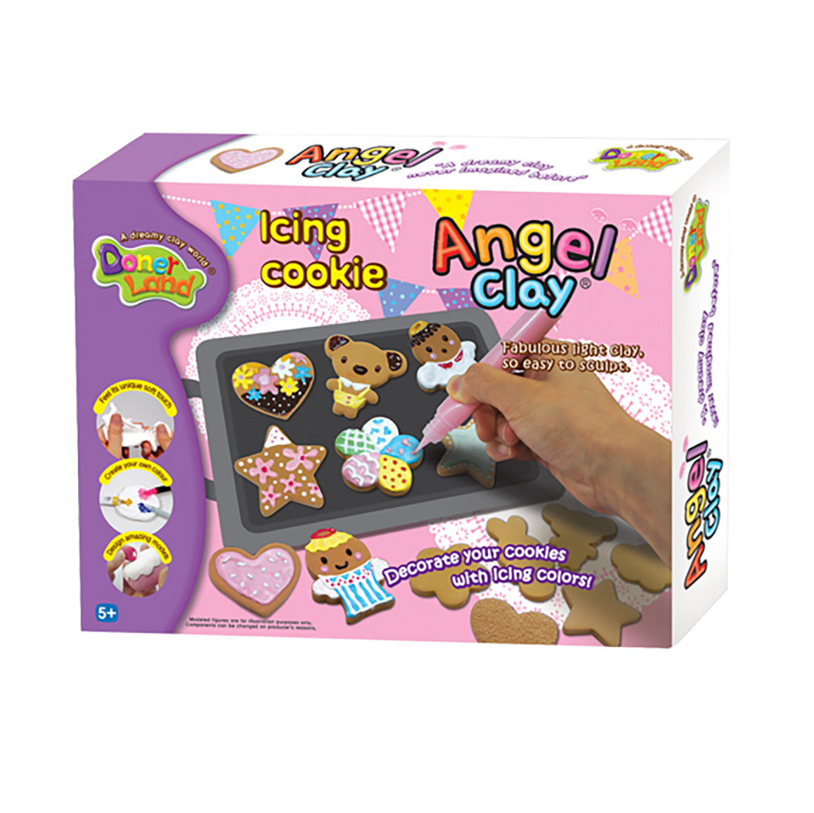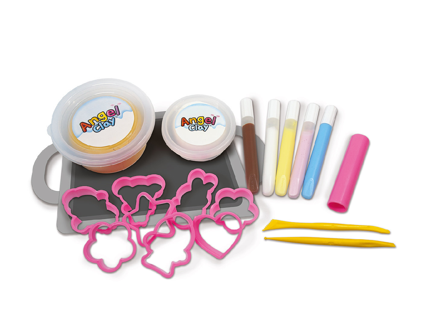 韓國Donerland天使黏土系列 : 天使黏土是一種以最新奈米技術研發的黏土,不沾手、好塑型、比一般黏土輕了1/8的重量。可以依照喜好,用水性顏料染出自己心目中的顏色,包括水彩、麥克筆、螢光筆、彩色筆等。天使黏土很輕,在日本、韓國都相當受小朋友喜愛。天使黏土-餅乾遊戲。內容物包含 : 天使黏土(淺咖啡色40g、白色12g)、形狀模具8款、裝飾筆5隻:含白、粉、黃、藍、深咖啡色、紙烤箱托盤、黏土工具、說明書。