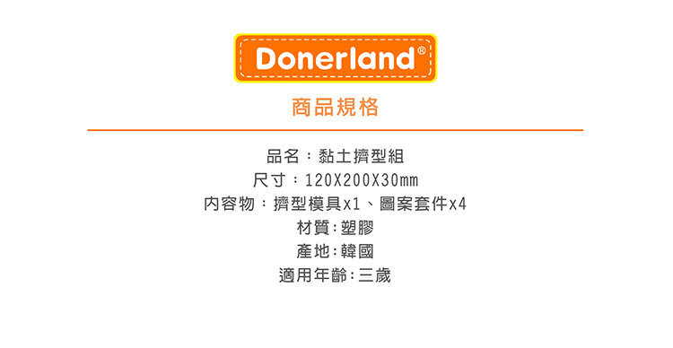 黏土擠型組。說到玩黏土,最讓孩子樂此不疲的就是完成作品的成就感了吧!Donerland很貼心的為孩子準備一系列黏土模具,其數量款式不勝枚舉! 訓練孩子善用工具,訓練孩子的手部精細動作,雕塑自己的作品!