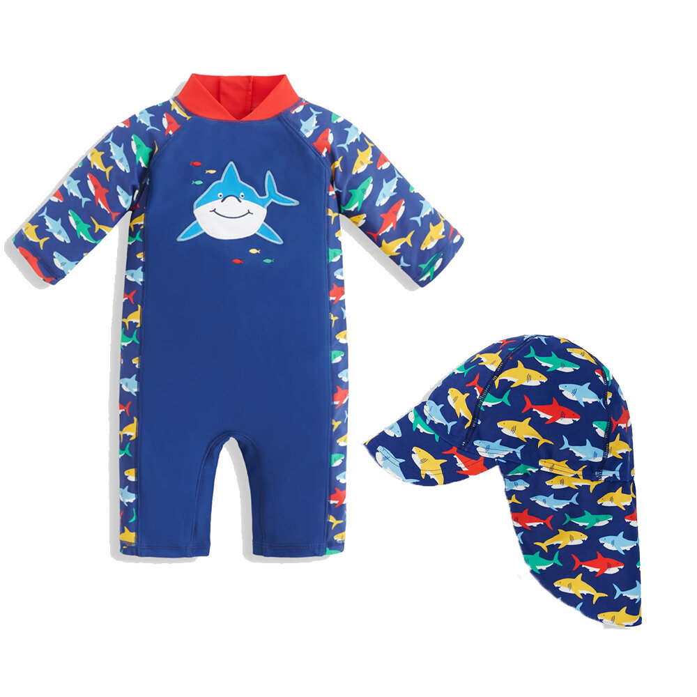 【超優惠套組】 英國 JoJo Maman BeBe 連身式泳裝+防曬護頸遮陽帽_JJB007