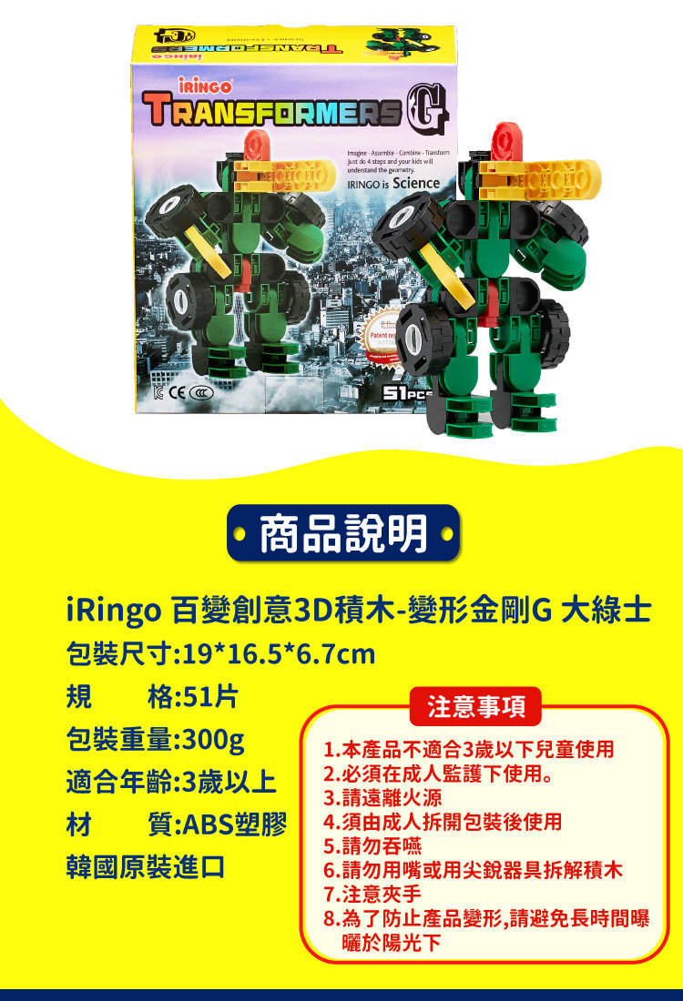 【韓國iRingo】百變創意3D積木-變形金剛G-大綠士 (可變形&可旋轉)_iR005(總片數:51)