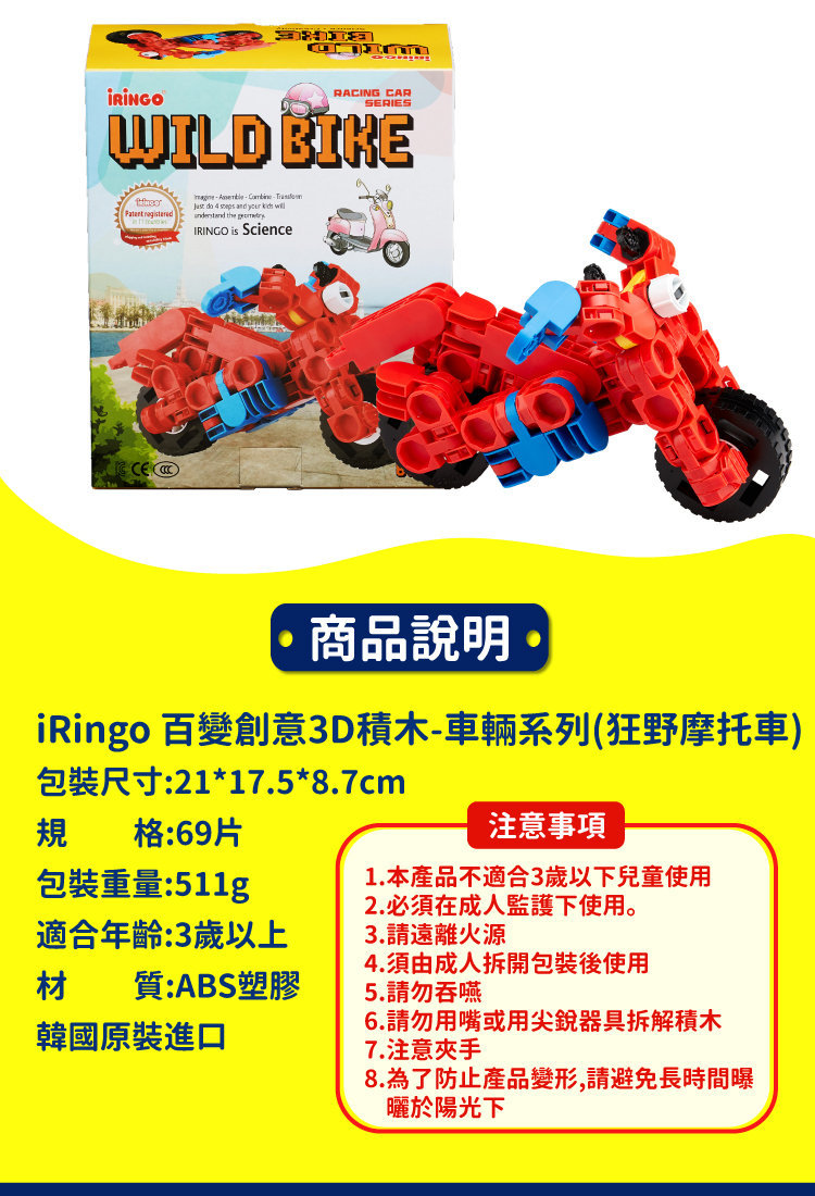 【韓國iRingo】百變創意3D積木-車輛系列(狂野摩托車)_iR021(總片數:69)