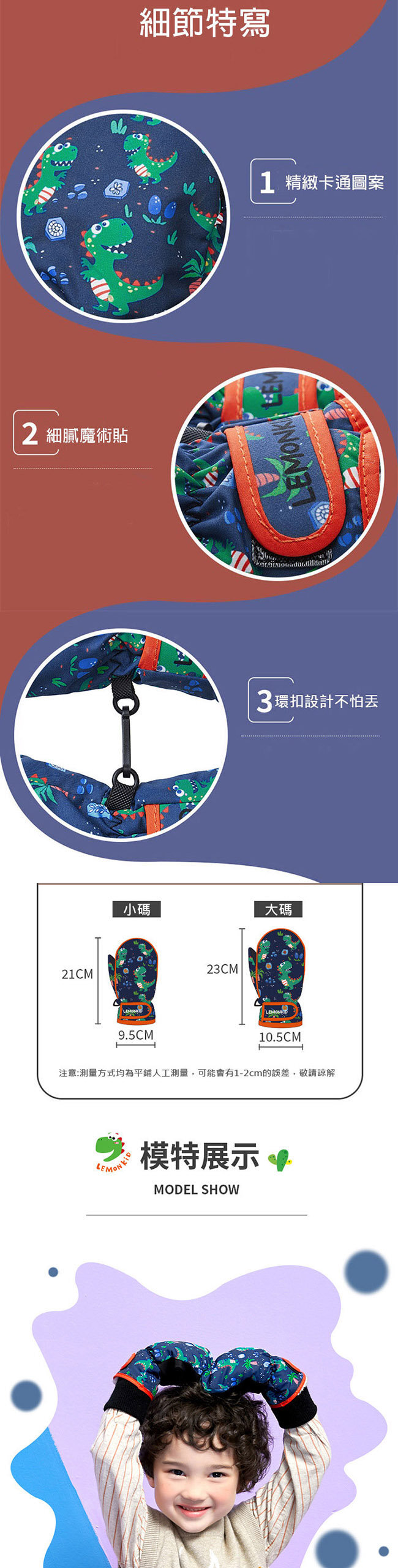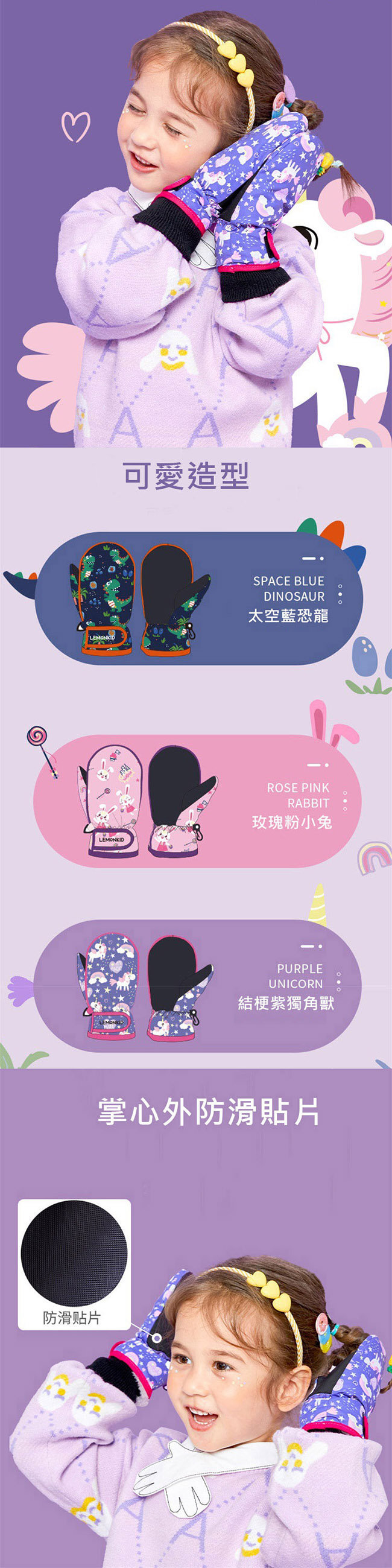 【JB DESIGN】Lemonkid-卡通圖案滑雪手套-空藍恐龍