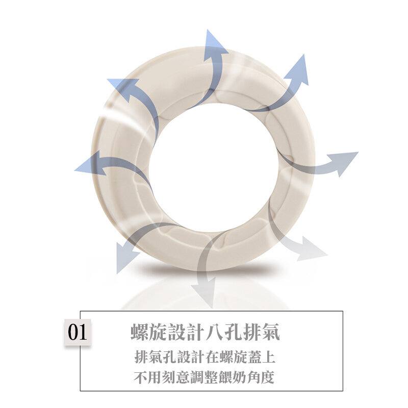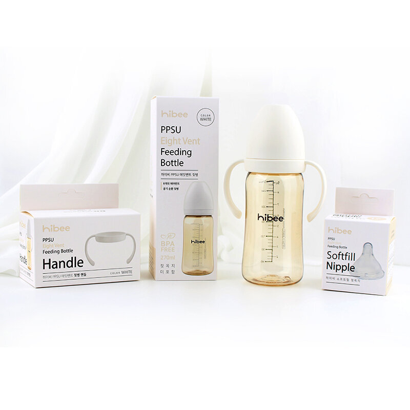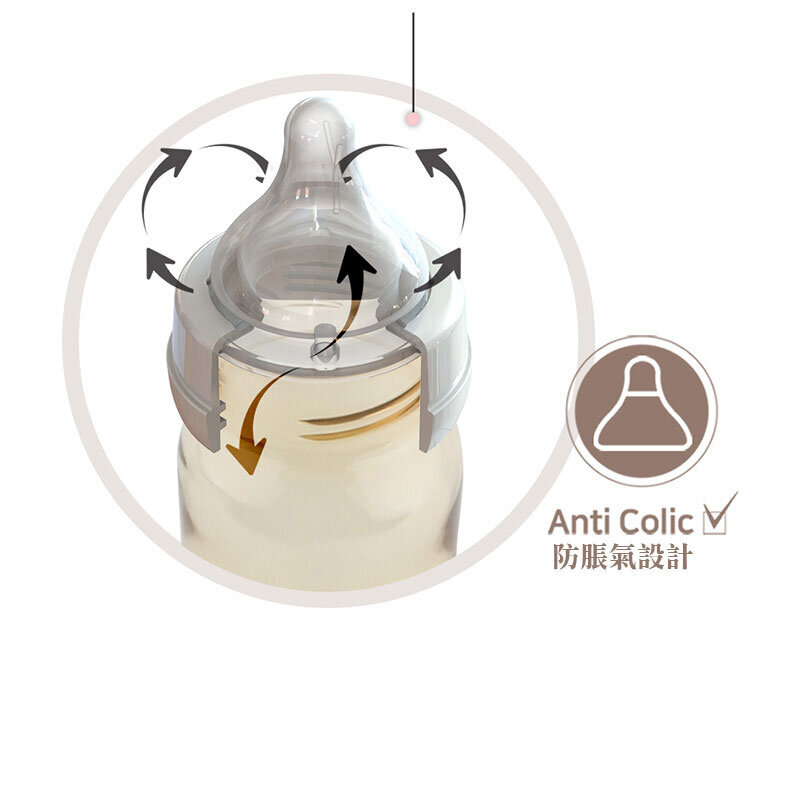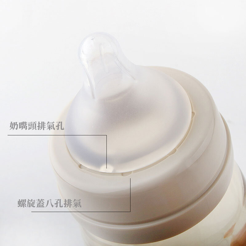 1-有以下超強革新研發設計---- 最強研發 『8孔360°立體循環』防脹氣:針對防脹氣問題大革新,有奶嘴與瓶口接合處有八孔,可360°循環排氣平衡內外氣壓,無死角不用刻意調整角度,超級有效防脹氣/嗆奶,是媽媽的最大福音。2- 一瓶多用,只要更換嘴頭,可以是奶瓶也可以是水瓶: (四階段使用奶瓶/水瓶見產品說明)--喝奶階段:隨著寶寶的成長,可更換不同尺寸的奶嘴,hibee 親膚仿媽咪乳房奶嘴共有四種尺寸(S/M/L/LL),不需更換奶瓶、只要更換奶嘴,即可因應寶寶成長階段不同需求。(四個尺寸奶嘴請見下方圖示說明)。請務必選擇適合尺寸以防嗆奶。-- 轉換成喝水瓶階段:只要更換成吸管頭就可變成水瓶。3-奶嘴設計:****其他品牌奶瓶也可以使用 (適用於任何瓶口4.7cm的各品牌奶瓶 )-- 奶嘴仿媽咪乳房觸感設計,兼具彈性、柔軟,寶寶能如吸母奶般自然吸吮,完全不費力轉換使用 hibee 奶瓶喝奶。-- 奶嘴內部有豎線設計,奶嘴柔軟卻不易塌陷,可幫助舌頭自然吸吮。-- 採 AVS 透氣孔設計,有效防脹氣,平衡奶瓶內外氣壓,讓寶寶可以順暢吸吮,空氣循環順暢,大幅降低寶寶脹氣問題。4-瓶身設計:來自世界大廠 Solvay原料-- 瓶身使用醫療級塑膠PPSU,來自世界大廠Solvay原料,耐高溫,可承受高溫消毒過程,也耐磨耐刮,掉落也不用擔心破裂。-- 瓶口加高螺旋加強防漏結構 (見下方圖示說明),防漏、並且鎖得更穩固,也不易被寶寶打開。-- 寬口瓶設計,裝奶粉時、喝完清洗時,都方便。5-把手設計:優雅的瓶身並增加把手設計,讓寶寶可輕鬆抓握奶瓶、自己學喝奶跟喝水。6-清潔方式: 所有配件都能拆開清洗或定期更換,可使用蒸氣/紫外線/水煮消毒,也能放進洗碗機中清洗,保持乾淨衛生。***可搭配 hibee 重力球使用:hibee 奶瓶最大革新就是讓寶寶喝奶也有重力球。吸管加上重力球,不論躺著、坐著、任何角度都能喝奶/喝水,是媽媽的最大福音。媽咪們可以加購重力球~