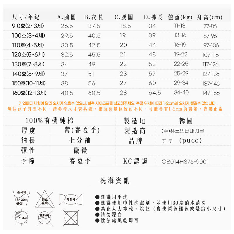 正韓 Puco 超優質嬰幼兒/兒童春夏七分袖100%純棉家居服/睡衣