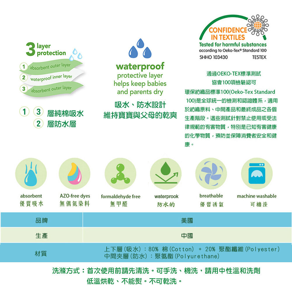 * 具有【上層棉質吸水+中層PU防水+下層棉質吸水】三層設計,除有十分優異吸水,寶寶大量流口水、漏奶、奶瓶不慎弄倒時,中間防水層可有效阻絕水往下滲透弄濕枕頭或枕巾