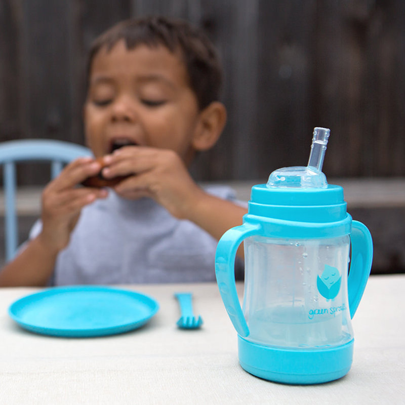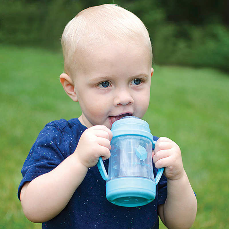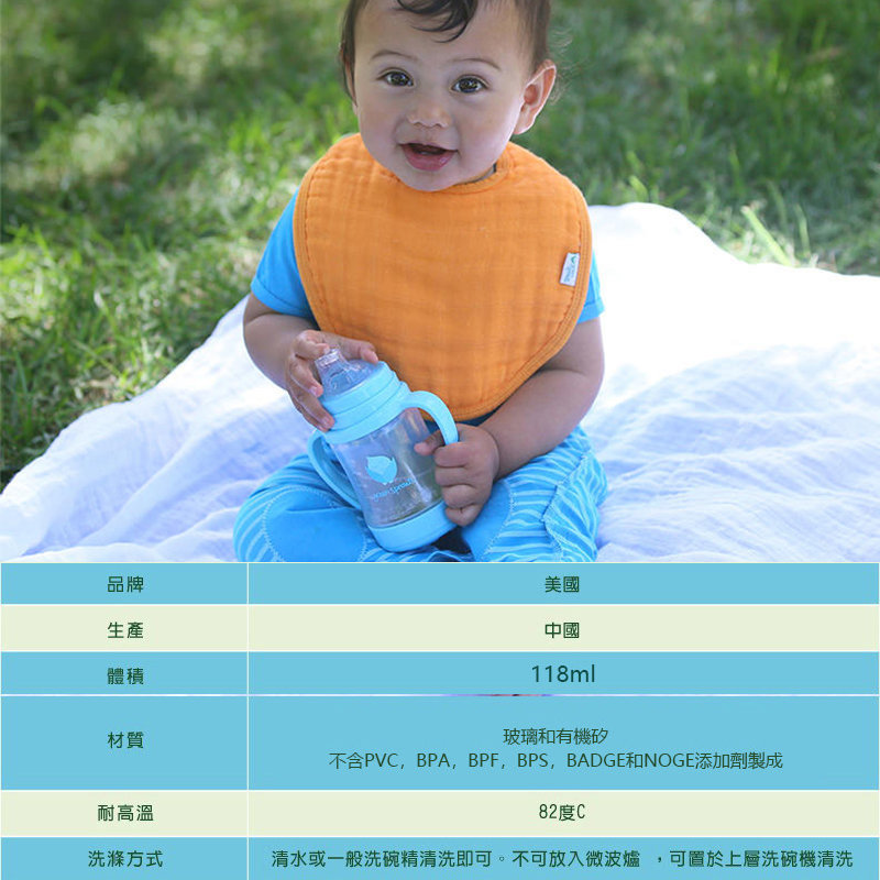 美國 green sprouts 小綠芽 外層防護無毒塑膠/內層玻璃之多用途雙層安全防護奶瓶/水瓶(118ML) _水藍色_GS124900-1