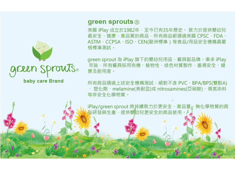 ※ Green Sprouts 為美國知名優幼兒品牌,致力於提供嬰幼兒安全、健康、高品質等食品/用品,符合美國/歐洲等各項食品/用品安全機構嚴格標準測試。