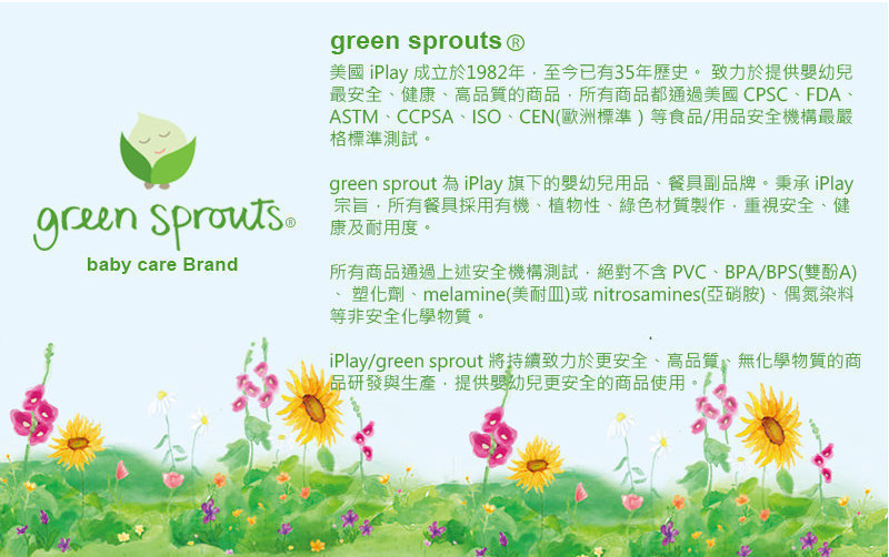 ※ Green Sprouts 為美國知名優幼兒品牌,致力於提供嬰幼兒安全、健康、高品質等食品/用品,符合美國/歐洲等各項食品/用品安全機構嚴格標準測試。