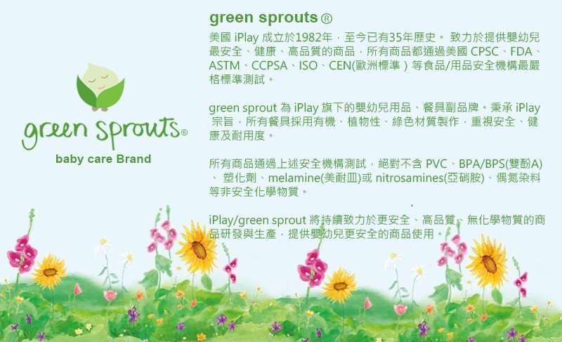 ※ Green Sprouts 為美國知名優幼兒品牌,致力於提供嬰幼兒安全、健康、高品質等食品/用品,符合美國/歐洲等各項食品/用品安全機構嚴格標準測試。