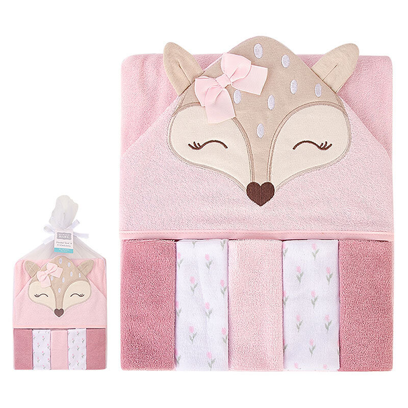 美國 luvable friends 甜蜜寶貝 嬰幼兒可愛動物連帽浴巾+小方巾/洗澡巾(共6入,送禮自用皆可) 76x76cm_美麗花鹿_LF57906