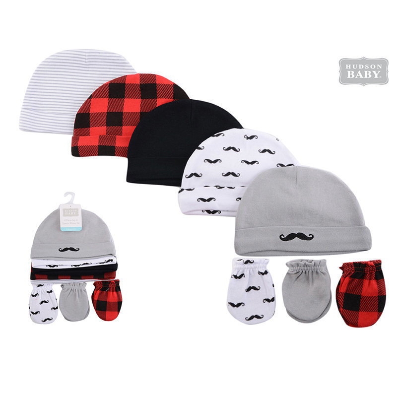 美國 luvable friends 甜蜜寶貝 100%純棉新生兒保暖棉帽+防抓手套/護手套8入組_ 黑紅格紋(LF51479)