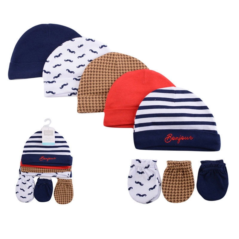美國 luvable friends 嬰幼用品 - 美國 luvable friends 甜蜜寶貝 100%純棉新生兒保暖棉帽+防抓手套/護手套8入組_藍色翹鬍子(LF51482)