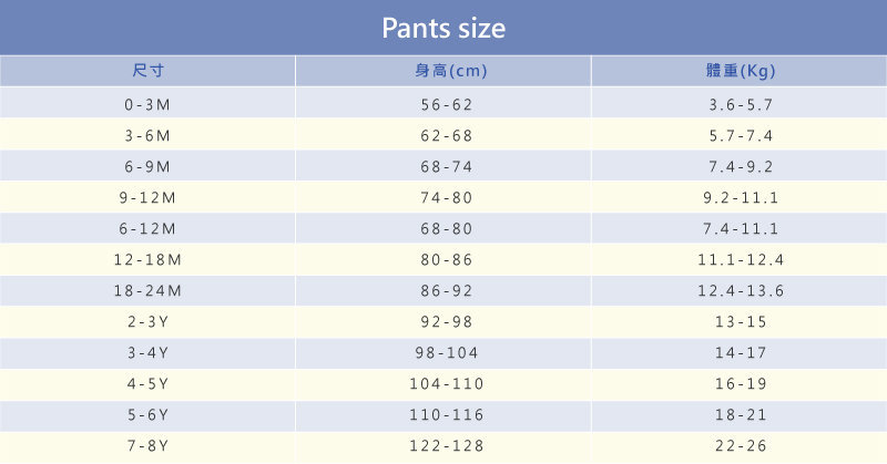 尺寸:0-3M;3-6M;6-9M;9-12M;2Y;3Y;4Y;5Y