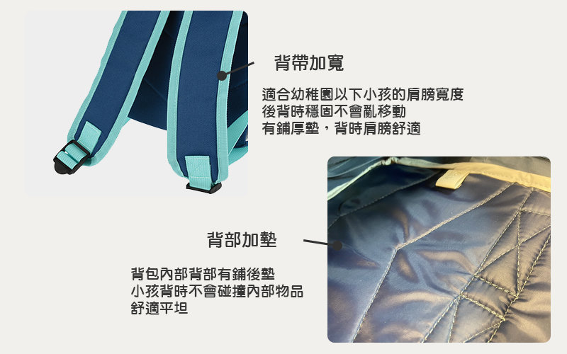 ※ 背袋有加寬,適合幼稚園以下小孩的肩膀寬度,背時穩固不會亂移動