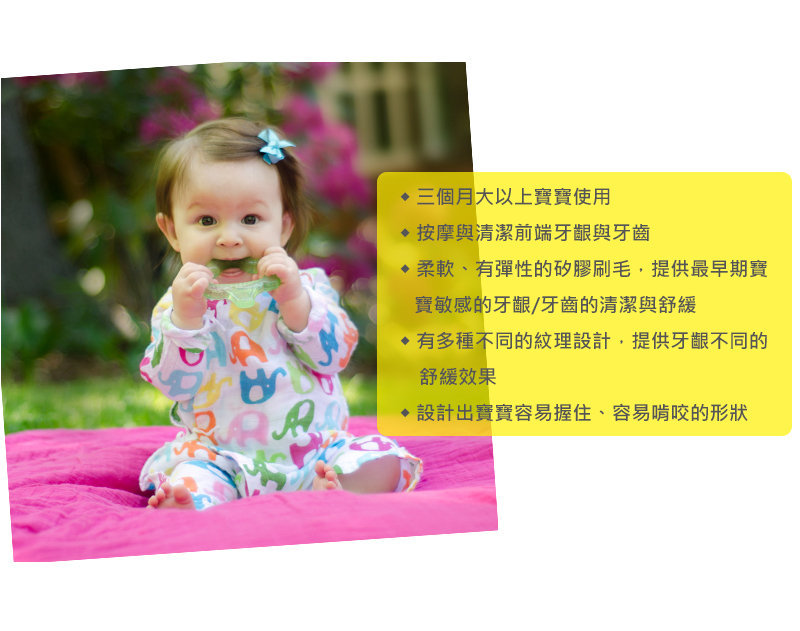 ※ 柔軟、彈性材質,可減輕寶寶長牙的不適與疼痛。
