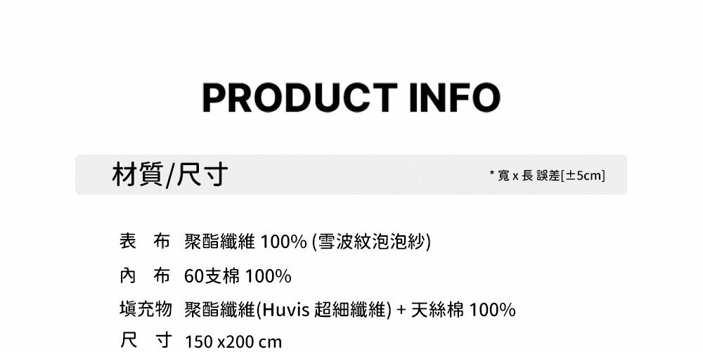 * 產地:韓國* 材質:外層 100%聚酯纖維(雪波紋) 內層 60支棉 填充物 聚酯纖維(Huvis 超細纖維)+100%天絲棉* 尺寸: 150 × 200 cm ,誤差±5cm