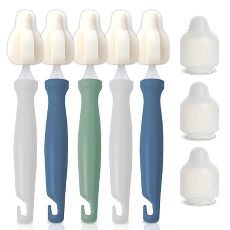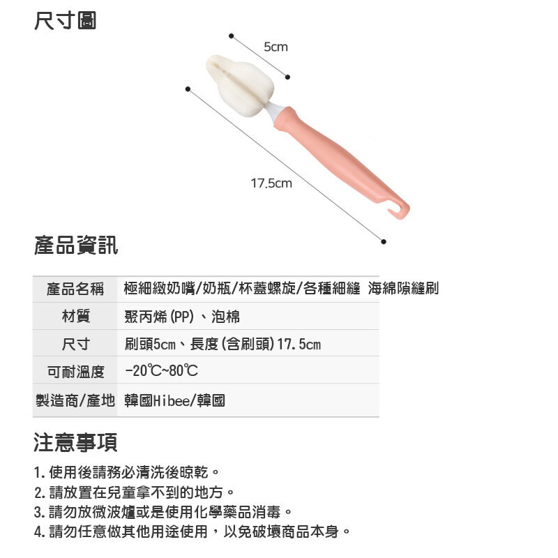 * 小巧柔軟的海綿能深入奶嘴、奶瓶、瓶蓋縫隙、瓶蓋螺旋,輕鬆將細縫污垢清洗乾淨。
