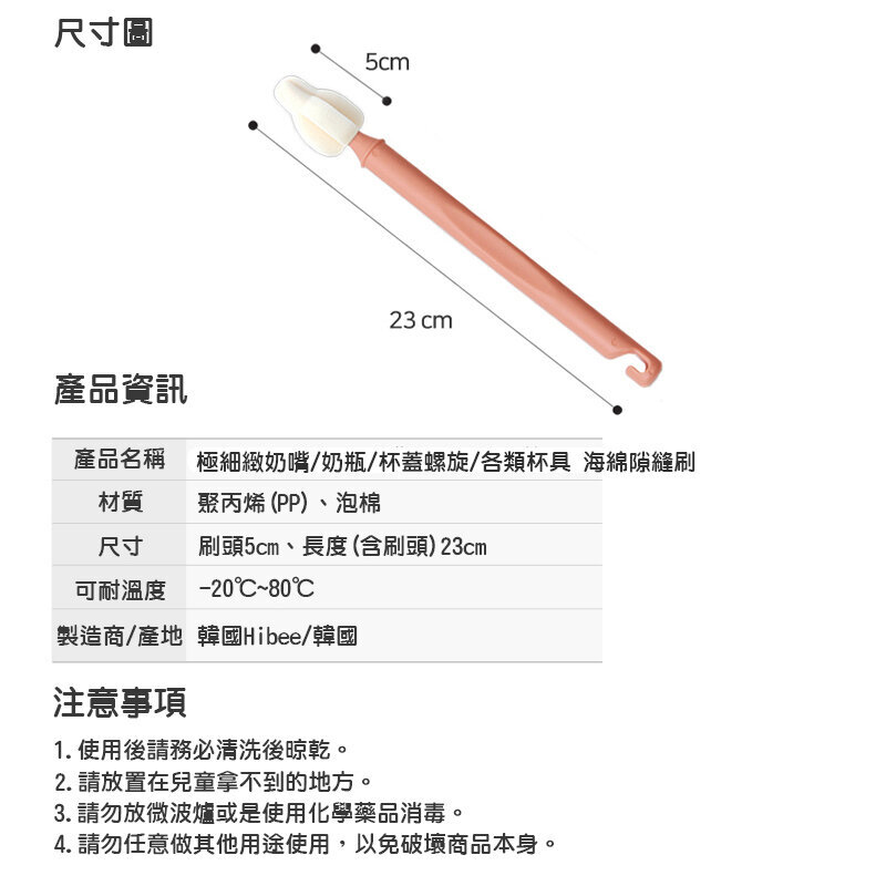 * 韓國銷售第一神刷* 韓國最大搜索引擎Naver 排名第一的清潔刷* 100% 韓國當地製造。* 使用德國製最高級 (80ppi) 海綿,開封後無異味,清洗不刮傷表面不留痕跡。* 高密度海綿有彈性不易撕裂耐用性佳,能產生豐富泡沫有利清潔。* 小巧柔軟的海綿能深入奶嘴、奶瓶、瓶蓋縫隙、瓶蓋螺旋,輕鬆將細縫污垢清洗乾淨。* 尖端凸起海綿,容易清潔到隙縫、底部邊緣。* 舒適好握的手柄,洗刷時更輕鬆愉快。* 長手柄可清洗瓶身高的水瓶、奶瓶、高腳杯、窄口杯。* 手柄尾端有S掛勾,方便收納、晾乾。* 附贈專屬收納防塵套,外出攜帶超方便。* 優雅柔和的色調提升餐廚質感。* 尺寸:刷頭5cm、總長度 23cm(含刷頭)