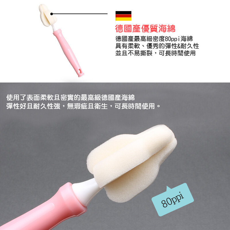 小巧柔軟的海綿能塞入奶嘴、瓶蓋縫隙,尖端凸起處,容易觸碰到瓶身底部邊緣,輕鬆將污垢清洗乾淨。