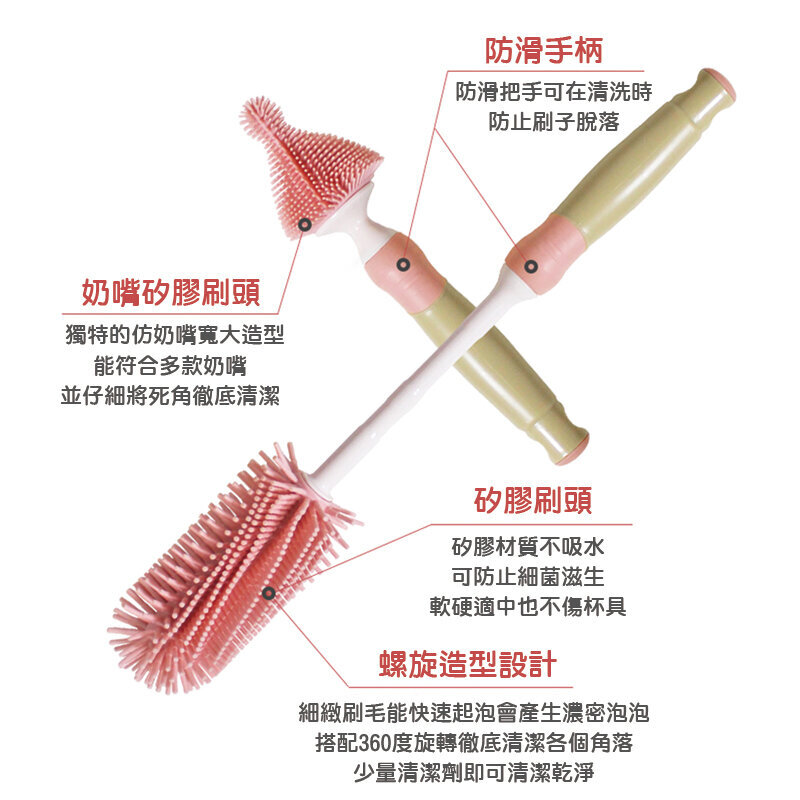 獨特的仿奶嘴寬大造型,能符合多款奶嘴並可仔細將死角徹底清潔。