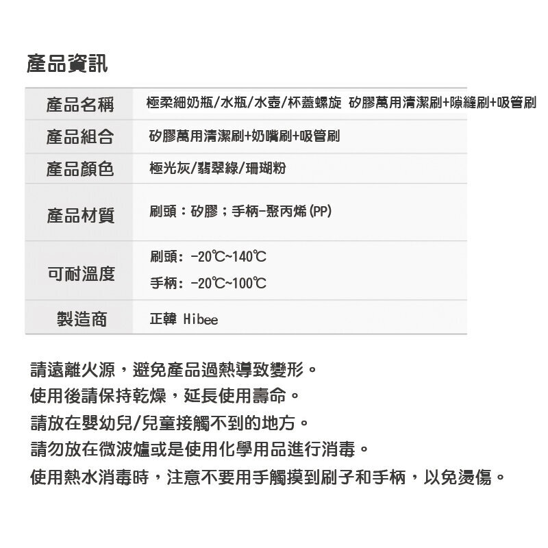 * 刷毛耐高溫120˚C,可水煮、蒸氣烘乾、紫外線消毒。