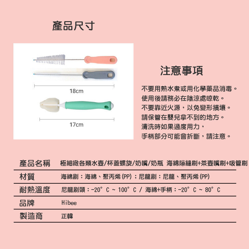 正韓 hibee 極細緻各類水壺/杯蓋螺旋/奶嘴/奶瓶 海綿隙縫刷+茶壺嘴刷+吸管刷3入組 (紅玫) HOB001R