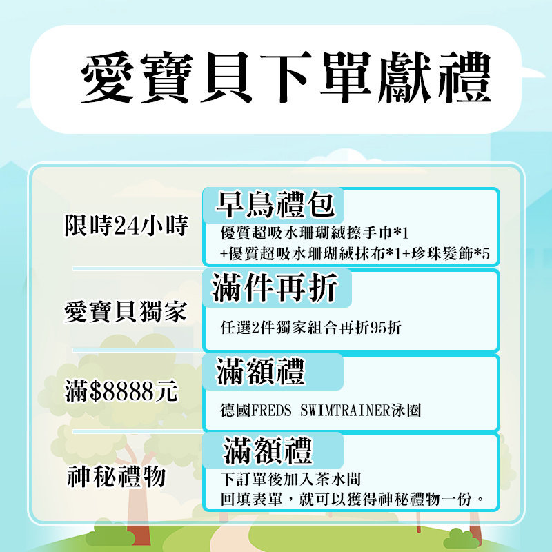 ✅加碼優惠贈送商品活動,如果遇到贈品數量不夠、爆單等情形,愛寶貝保有最終修改、變更、活動解釋及取消本活動之權利 (我們會改其他商品當作贈品)