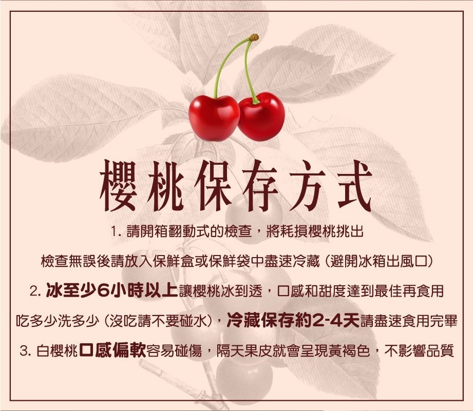 1.收到櫻桃後檢查無誤,需要冰入冰箱要超過六小時以上(水果才會自然退果酸),甜度才會出來.若生鮮品(華盛頓櫻桃)有問題,需再6小時之內回報.