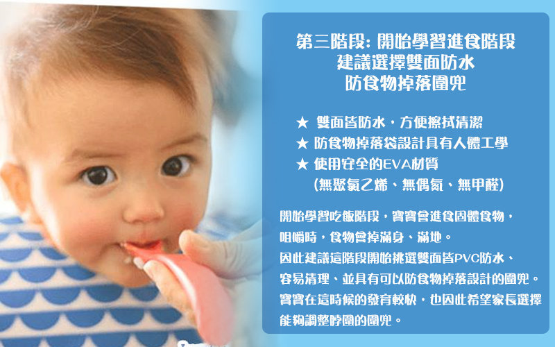❤️第三階段的圍兜是需要應對小怪獸開始學習進食的階段,這時期的小怪獸已經開始吃輕食或是固體食物,口水的分泌也不再輕易滿溢,因此圍兜最主要的用處是接取進食時孩子掉落的食物。為了維持小怪獸衣服清潔以及家裡地板著想,這個階段的圍兜要選擇防水好清洗+可接掉落食物的圍兜。