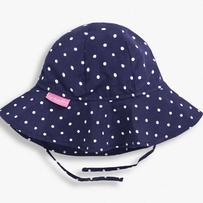 英國 JoJo Maman BeBe 嬰幼兒/兒童泳裝戲水UPF50+綁帶遮陽帽_藍底白點(JJH3172)