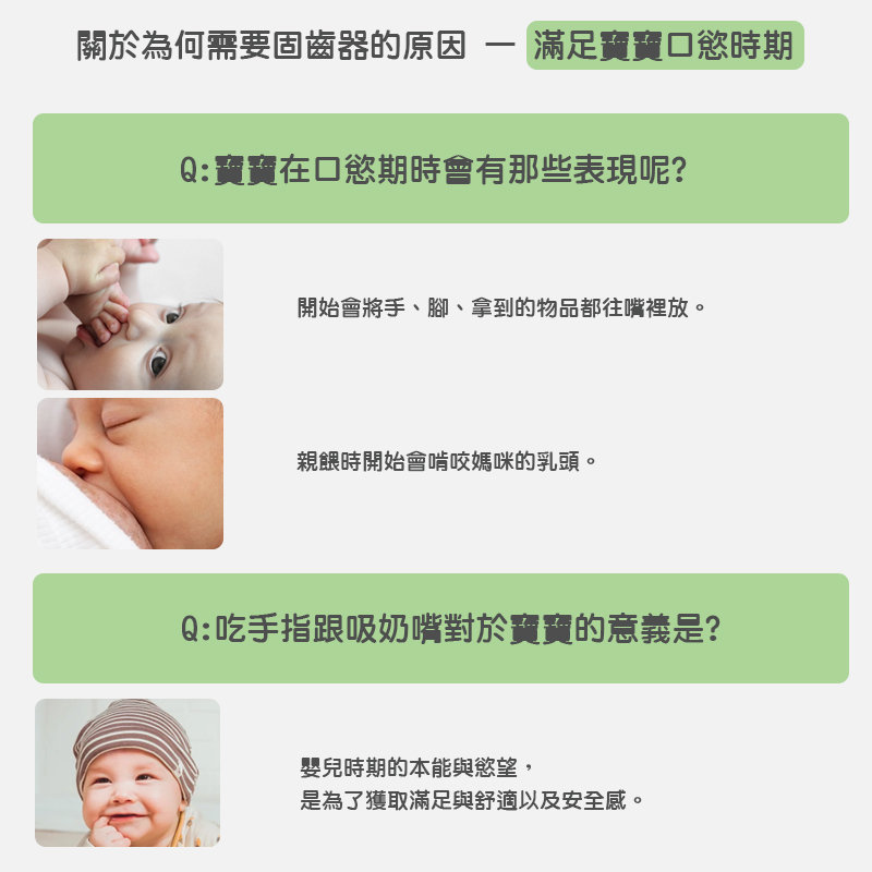 小怪獸約在4M開始就開始發展手部的運動(出現抓握反應)剛好跟小怪獸的口欲期重疊,因此可以透過固齒器來一舉兩得,也建議媽咪們選擇可以讓小怪獸好抓握的固齒器(中空設計、厚度寬度適中、設計簡單、止滑材質)