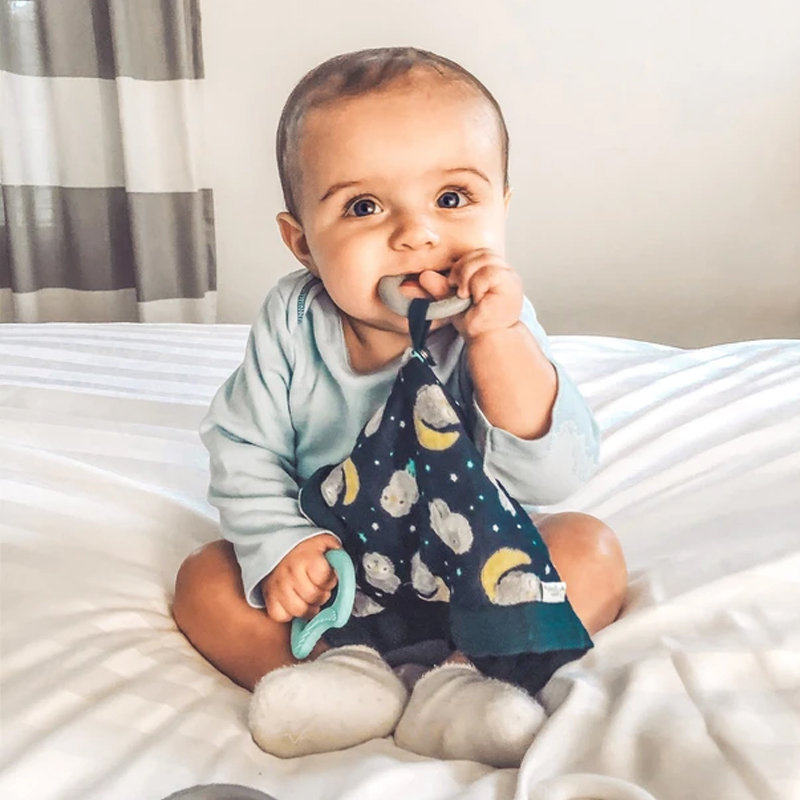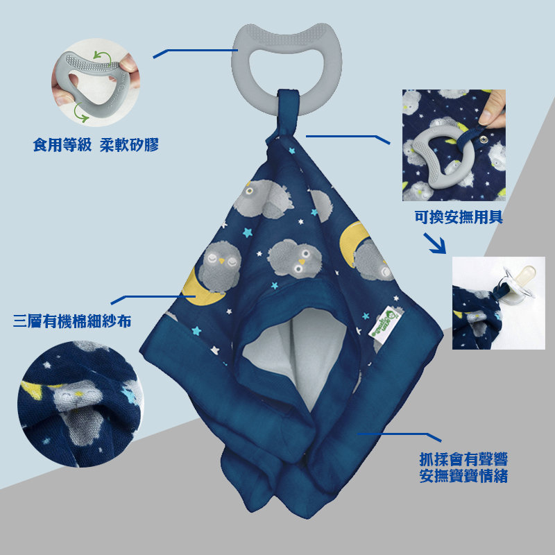 因應小怪獸的各種需求,市面上多了一種固齒器+安撫巾的產品,讓小怪獸可以同時擁有滿足口欲期也能透過安撫巾來撫慰情緒。