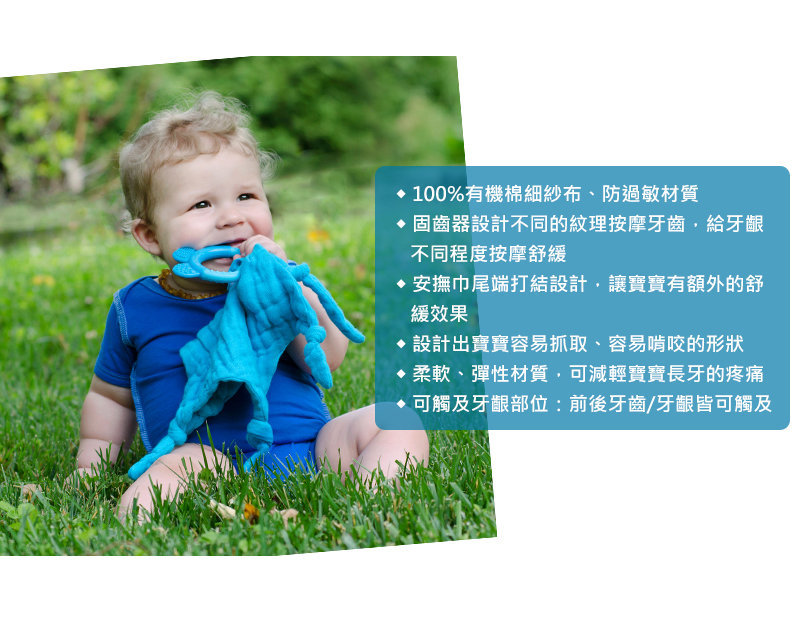 材質:安撫巾:有機棉細紗布。固齒器:矽膠